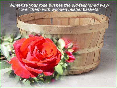Cutting dead wood from spent perennials in the garden and mulching beds- I'm sure your plants have been bitten once or twice by frost now(unless you're in a coastal area in New England), and its time for those fall gardening chores! Cut down any woody stems that have died from all of your perennials and put down a protective layer of mulch over them. Most organic materials such as leaves, grass clippings or even peat moss will do the trick. This layer over your garden should be one to two inches thick, enough to provide a little extra protection from New England winter temperatures and cold winds but not so much that you'll be digging up wheel barrels of the stuff next spring. The other beneficial thing it does is that it will break down somewhat over the winter, supplying your plants with some fresh nutrients during their spring and summer growth and helping your historically sandy soil retain water better. Roses are especially susceptible to wind damage in the garden- old timers in New England would cut their bushes to about 12-18 inches above the ground, mulch slightly with organic matter around their base, then cover them with wood baskets. The wood would insulate the rose bushes from the biting winds of winter but would still let air in to circulate and prevent rotting. Today, many garden centers sell styrofoam rose covers- we suggest you do not use them because they allow no air in to circulate and can often kill the bushes during the early spring.